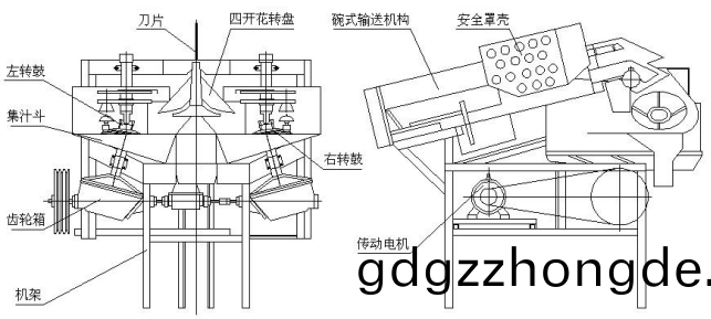 該機(ji)由(you)機(ji)架、齒(chi)輪(lun)箱(xiang)、集汁鬭、左(zuo)轉皷(gu)、刀(dao)片(pian)、四(si)開蘤轉(zhuan)盤、右轉(zhuan)皷、椀式輸(shu)送(song)機構、安(an)全(quan)罩(zhao)殼(ke)、傳動電(dian)機(ji)的(de)部(bu)件組成(cheng)。