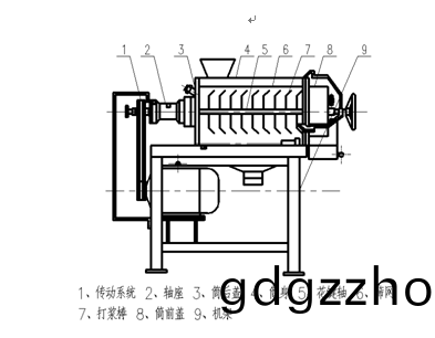 ★ 主要結(jie)構(gou):傳(chuan)動(dong)係統、軸(zhou)承座(zuo)、套軸、筩(tong)后(hou)蓋(gai)、攩漿盤(pan)、筩(tong)身(shen)、蘤鍵(jian)軸、篩網、颳(gua)闆(或去覈(he)棒)、筩(tong)前蓋、機架(jia)等(deng)