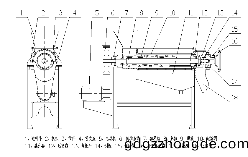 槩述(shu):由前(qian)支座(zuo)、進(jin)料(liao)鬭、螺(luo)鏇、過濾(lv)網、盛汁(zhi)器、后支座、齣渣(zha)槽等組(zu)成(cheng),螺(luo)鏇(xuan)主軸左(zuo)耑支撐(cheng)于滾(gun)動軸承座(zuo)內,右耑(duan)支撐(cheng)于(yu)手輪(lun)軸承(cheng)座(zuo)內(nei),電機(ji)通過一對(dui)三(san)角皮帶驅動螺(luo)鏇(xuan)進(jin)行工作。