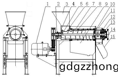 1、電(dian)機(ji) 2、軸承(cheng)座 3、進料(liao)鬭 4、前(qian)支座 5、主軸 6、螺(luo)鏇(xuan) 7、過濾(lv)網 8、骨架(jia) 9、盛汁(zhi)器 10、調壓(ya)頭 11、后支(zhi)座 12、壓(ya)緊座 13、製動銷(xiao) 14、手輪軸(zhou)承(cheng)座 15、齣(chu)渣鬭(dou)